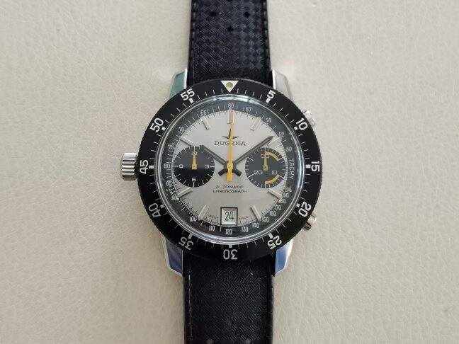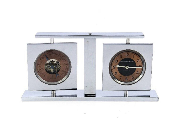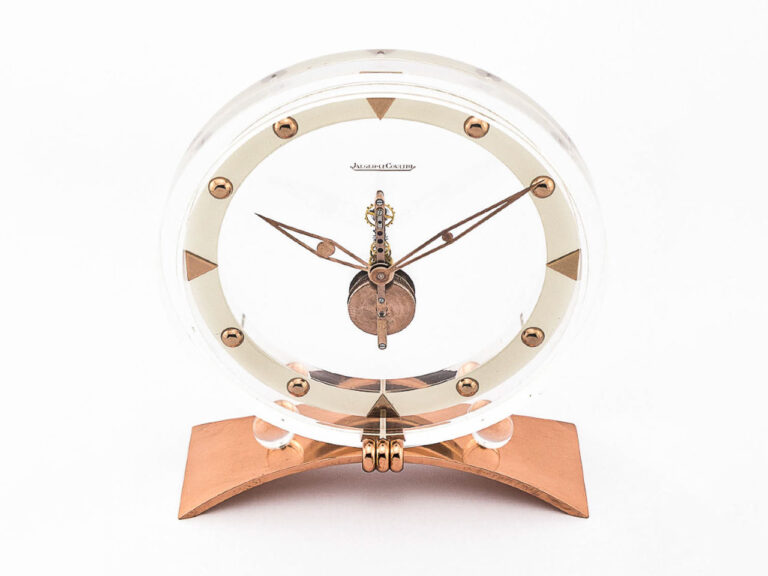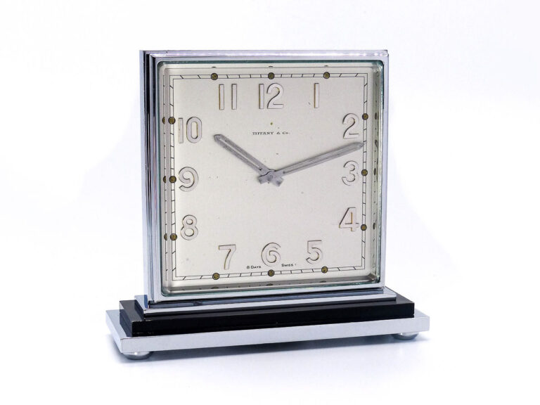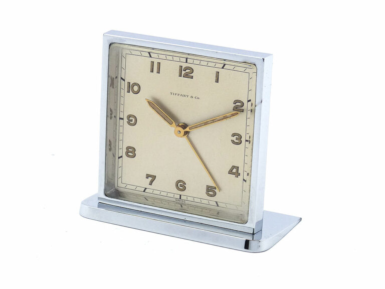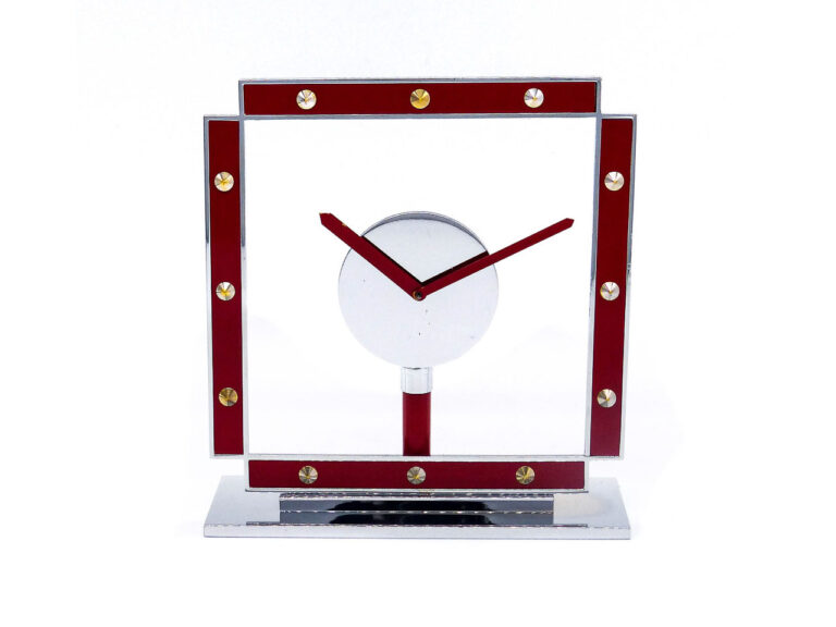 Extrem seltene Tischuhr im vernickelten Gehäuse. Transparentes…