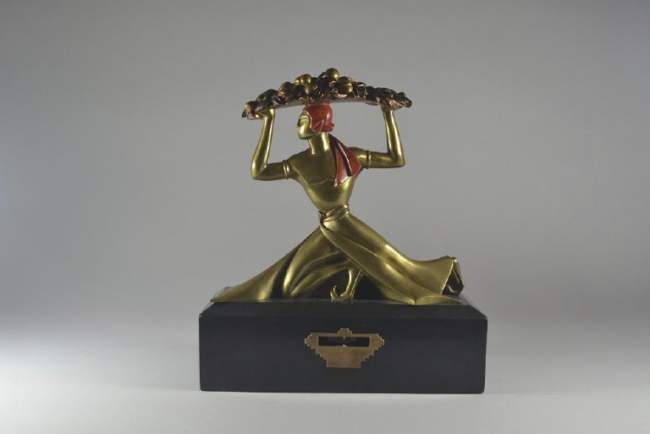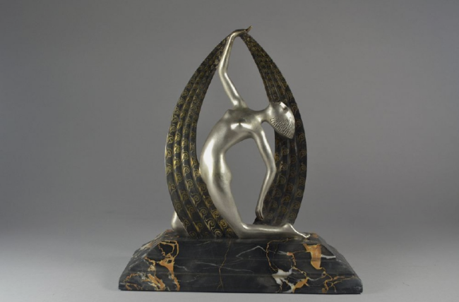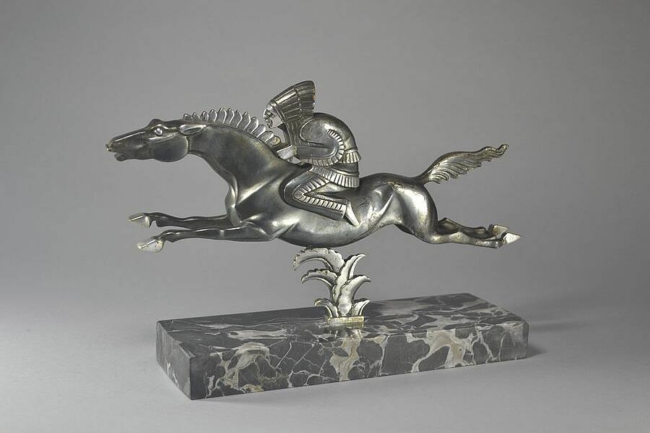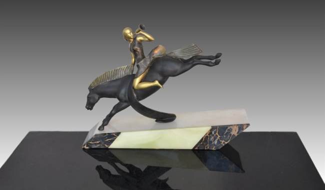 Art Deco-Skulptur „Reiterin mit Trompete“. Metall, dunkel patiniert und vergoldet. Auf Onyx-Marmor-Sockel. Masse: 55cm X 11cm X 40cm. Frankreich, um 1925. Preis auf Anfrage/Price on request