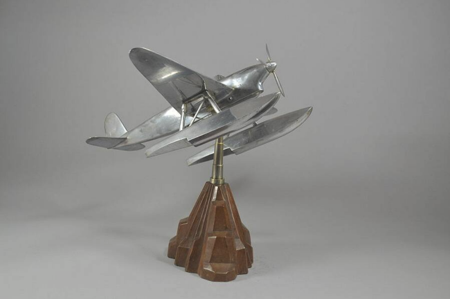 Extrem seltenes Flugzeugmodell, Aluminium poliert (mit Patina), auf Art Deco Holzsockel. Drehbar. Frankreich um 1930-35. Preis auf Anfrage / Price on request