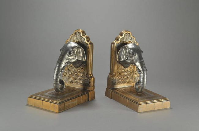 Art Deco „Elefanten“-Buchstützen. Metall, Silber- und Goldfarben patiniert. Ungewöhnliche Ausführung im Top-Zustand. Markiert: Made in France“. H: 16,5cm L: 14cm T: 9cm. Frankreich um 1930 Preis auf Anfrage – Price on request