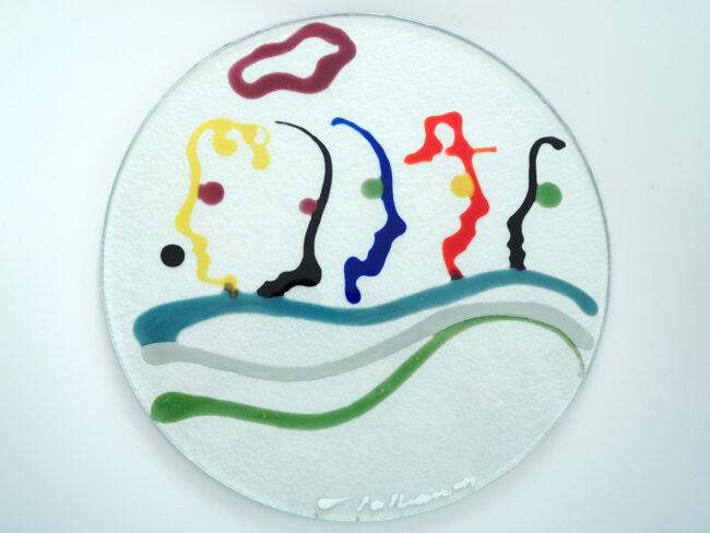 Glas-Unikat-Platzteller ∅ 33cm. Mit Farbpigmenten gemalte Motive in Glas gebrannt. Im Glas signiert/monogrammiert und datiert. Preis je Teller Euro 1.650.-
