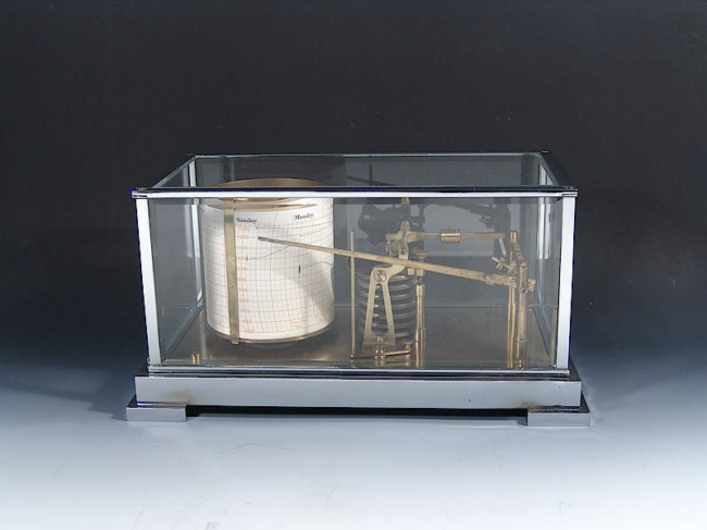 Art Deco Barograph mit 7 Tageuhrwerk. Verchromtes 5-Glas-Gehäuse. Innen Messing, teils vergoldet. Luftdruckaufzeichnung über 7 Tage mit nichttrocknender Tinte. Tinte + Papier sind vorhanden. Preis auf Anfrage/Price on request