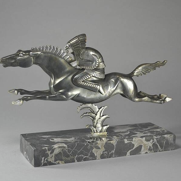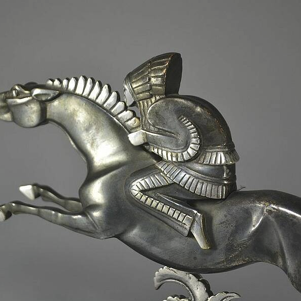 Art Deco. Versilberte, partiell dunkel patinierte Bronze-Skulptur eines reitenden Indianers, auf grauem Portor-Marmor-Sockel. Signiert: Brau. Höhe: 22cm. Extrem selten! Frankreich um 1930. Preis auf Anfrage / Price on request Project navigationZurückPrevious project:Art Deco Wasser-Flugzeug-ModellNächstesNext project:Art Deco Bronze „Tänzerin mit Schal”