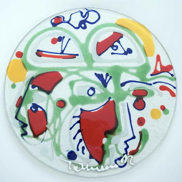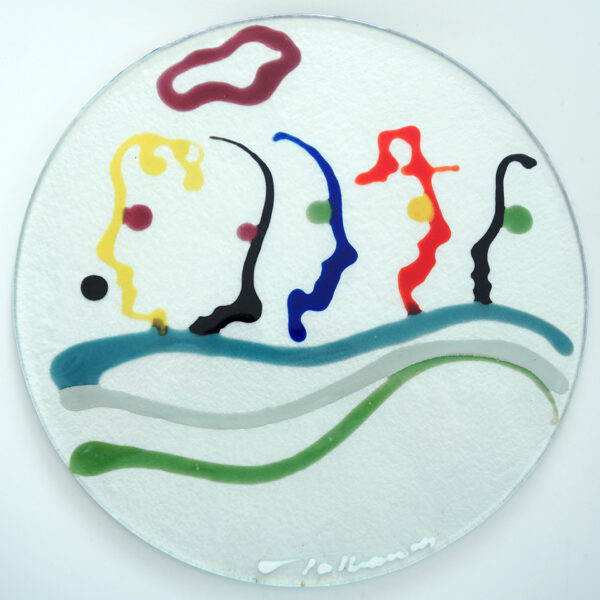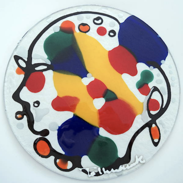 Glas-Unikat-Platzteller ∅ 33cm. Mit Farbpigmenten gemalte Motive in Glas gebrannt. Im Glas signiert/monogrammiert und datiert. Preis je Teller Euro 1.650.- Project navigationZurückPrevious project:Art Deco „Elefanten”- BuchstützenNächstesNext project:Glas-Unikat-Platzteller