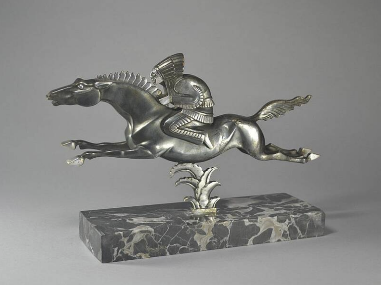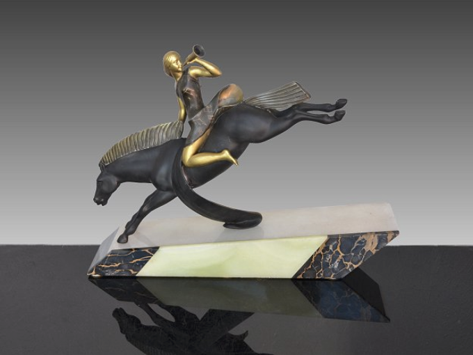 Art Deco-Skulptur „Reiterin mit Trompete“. Metall, dunkel…