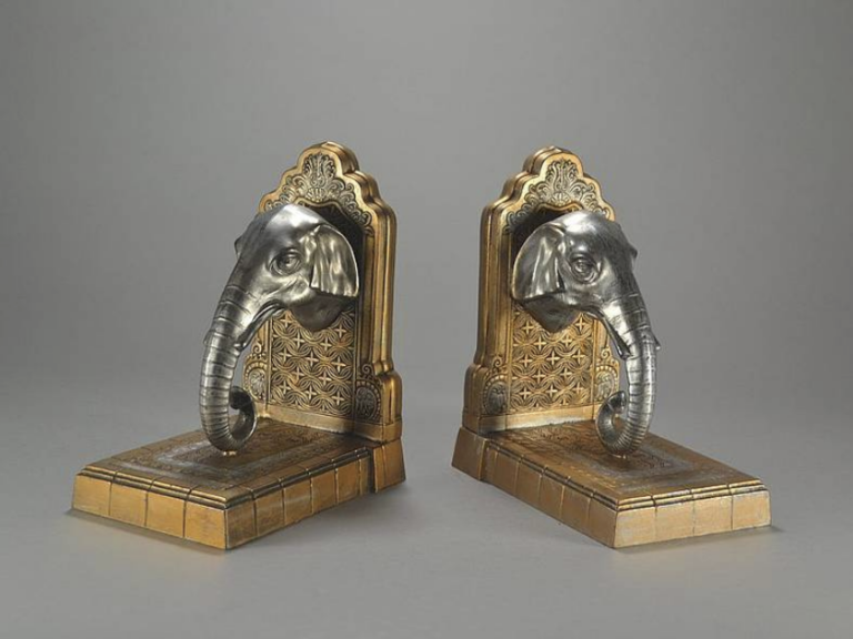 Art Deco „Elefanten“-Buchstützen. Metall, Silber- und Goldfarben…